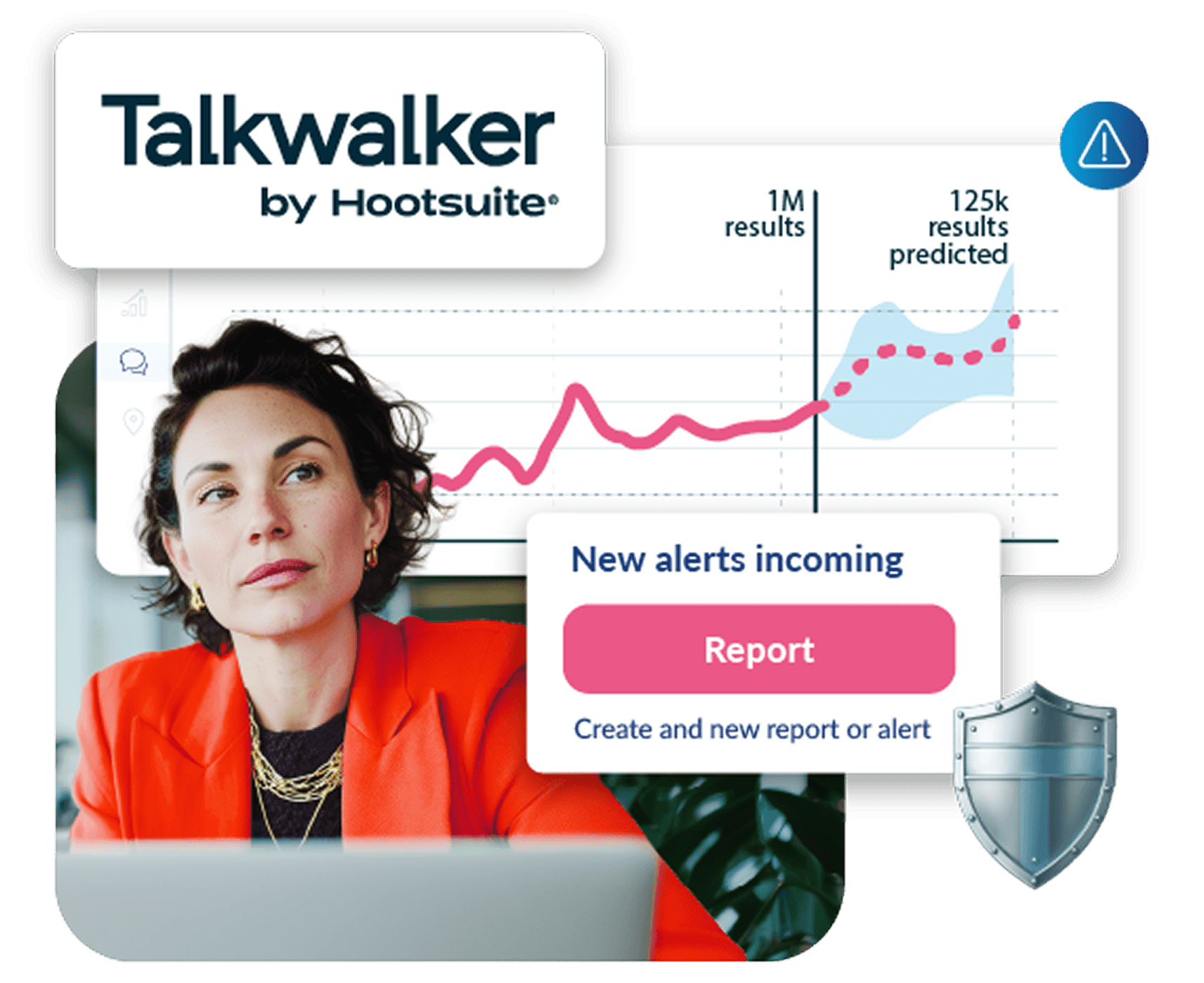 Talkwalker analytics dashboard showing rising trend graph with 1M results and 125k predictions, featuring alert creation interface and shield icon